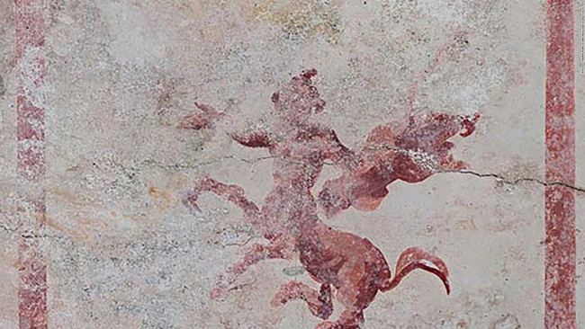 Pe pereţii incintei, numită de arheologi "Camera Sfinxului", se află desene ale unor creaturi reale sau mitice, printre care şi un sfinx. Desenele murale sunt pictate folosind pigmenţi cu culori vii, în special roşu, verde şi galben şi au rezistat în condiţii bune trecerii a aproape două milenii. Pe pereţii încăperii mai sunt imagini cu centauri, cu semizeul Pan, jumătate om-jumătate ţap, dar şi cu plante decorative precum şi o scenă în care un bărbat înarmat cu o sabie înfruntă o panteră.