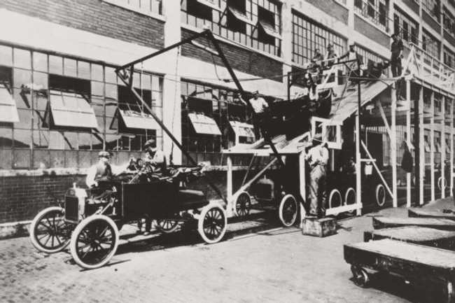 Dar nici vorbă de altruism în aceste măsuri, căci Henry Ford nu era nici filantrop şi nici comunist. O modificare tehnologică a fost cea care a înlesnit totul:după ce s-a încercat în toamna lui 1913 producţia pe linia de asamblare, procedeul s-a generalizat. Modelul T se producea acum pe bandă rulantă, literalmente, şi a fost un salt imens în industrializare. Ideea i-a venit de mai demult, văzând cum se procedează în măcelării. Şi a decis până la urmă să înlocuiască producţia staţionară cu un proces mai complex, dar şi mult mai rapid.