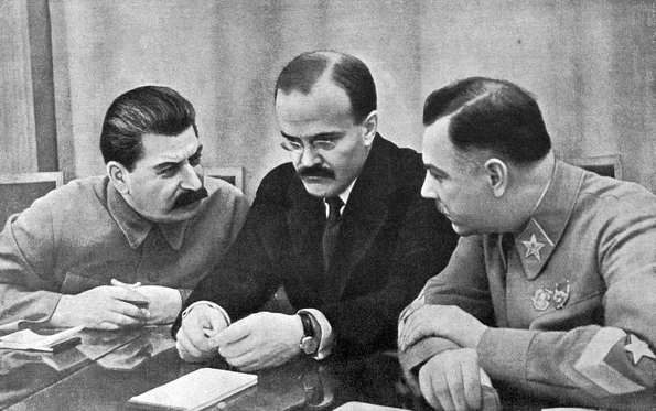 Foto sus: Stalin, Molotov și Voroșilov (© Wikimedia Commons)