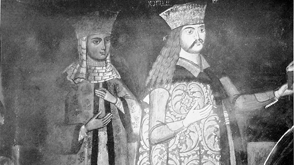 Foto sus: Radu cel Mare soția sa, doamna Cătălina. Frescă de la Mănăstirea Govora